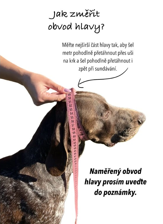 Obojek vyrábíme na míru. Proto prosím uveďte naměřený obvod hlavy dle instruktážní fotky do poznámky.